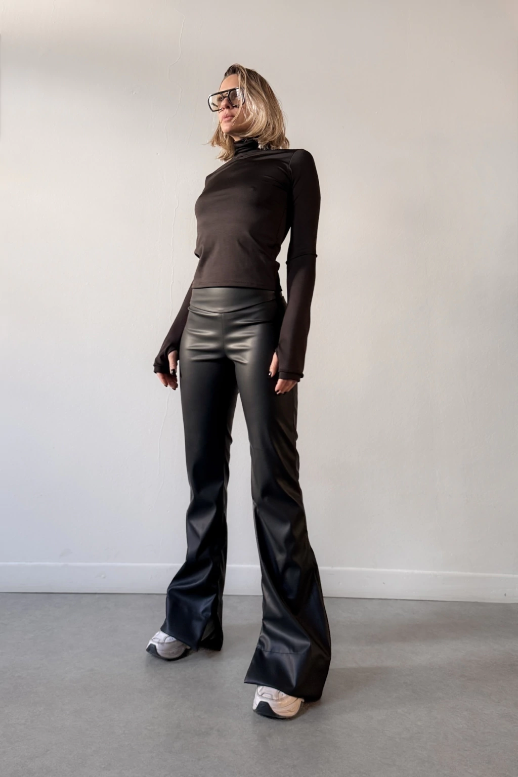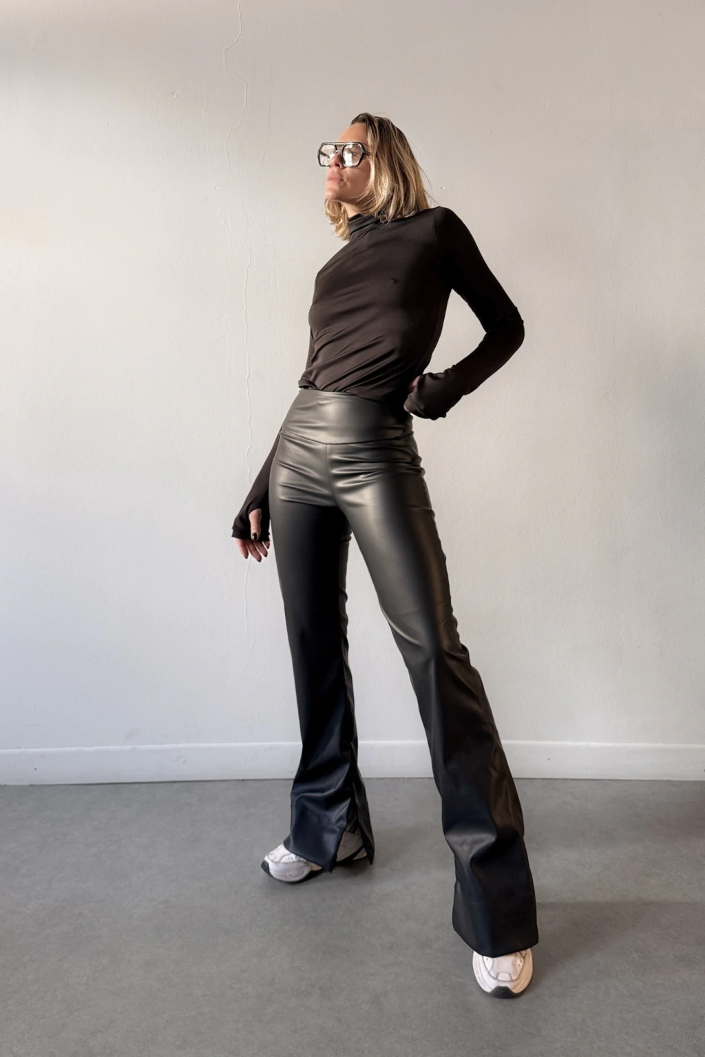 Pantalón flare/semi oxford tiro alto, con detalle de terminación de ruedo bien ancho con tajo interno fijo de 9 cm + apertura regulable hasta 25 cm mediante cierres. Cintura reforzada con doble tela y acceso con cierre invisible.