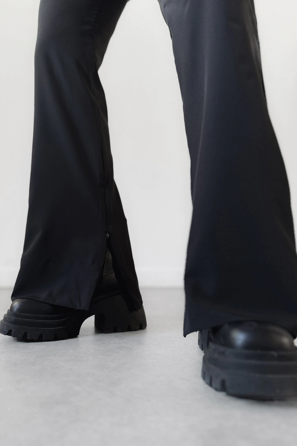 Pantalón flare/semi oxford tiro alto, con detalle de terminación de ruedo bien ancho con tajo interno fijo de 9 cm + apertura regulable hasta 20 cm mediante cierres. Cintura reforzada con doble tela y acceso con cierre invisible en lateral.