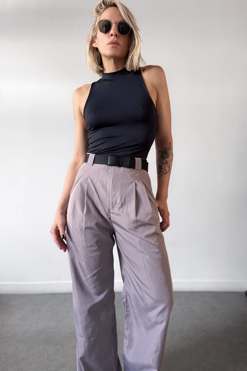 Pantalón pinzado, corte sastrero wide y tiro bien alto, con pliegues en delantero y presillas anchas con cinto. Tela plana, satinada y liviana, tipo memory. Viene con cinturón táctico marinero incluído, pero no es fijo, es decir que podes usarlo con o sin cinto o intercambiarlo con otro.