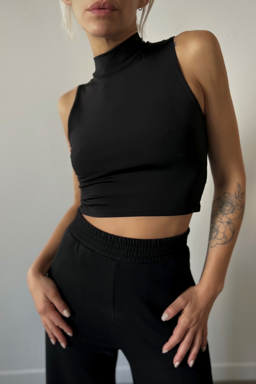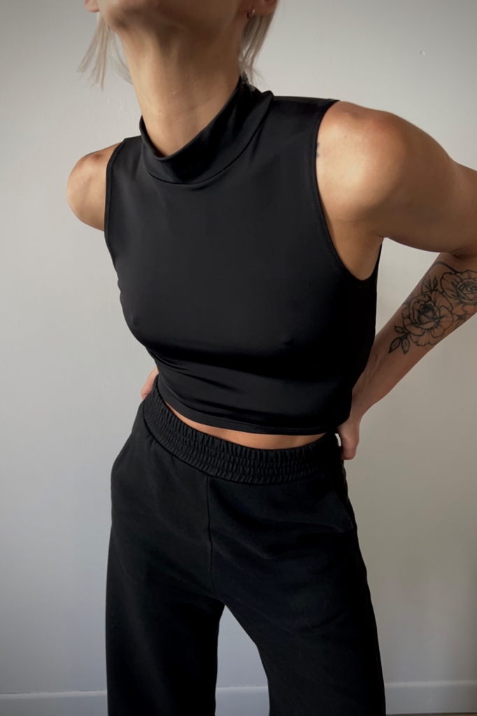 Descripción: Top musculosa con escote redondo y polera. Terminaciones con ruedo en bajo y sisas. No trasluce y tiene buen agarre.
