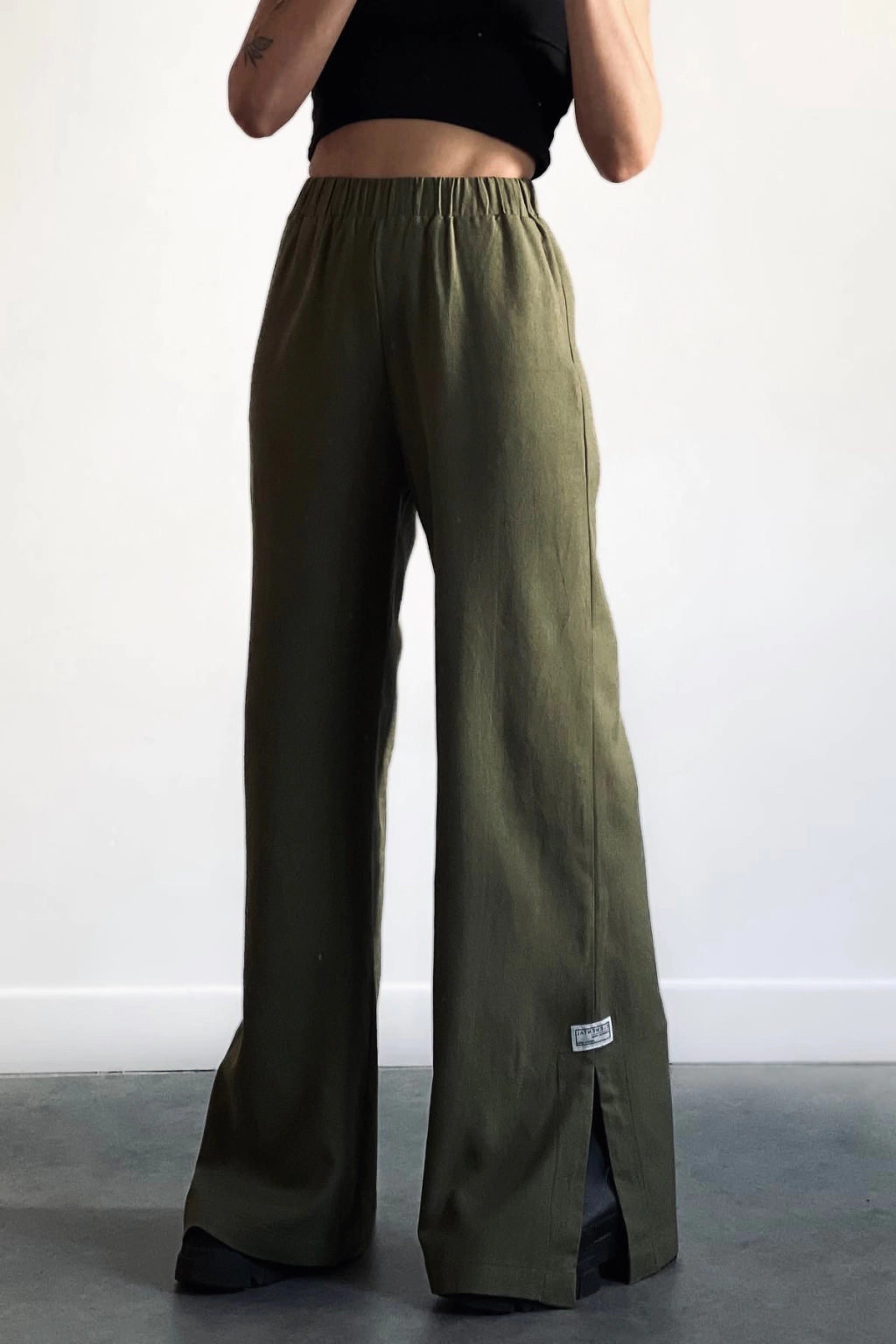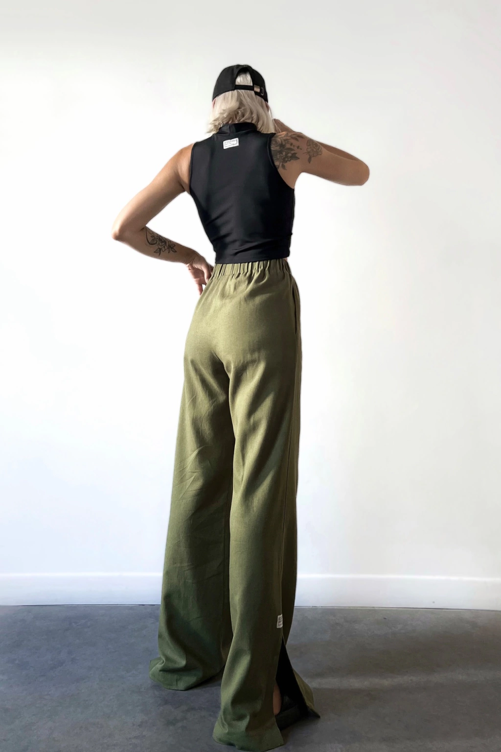 Pantalón wide de lino pantalonero. Tiro bien alto y cintura mega cómoda y adaptable con elástico interno, bolsillos diagonales sastreros amplios y detalle de tajo con vista interna en el lateral externo de la pierna. De tela plana, rígida y sin rebote, con buena caída y grosor. CÓMODO, CANCHERO, RELAJADO Y ELEGANTE. Súper versátil, es perfecto tanto para looks de día como de noche.